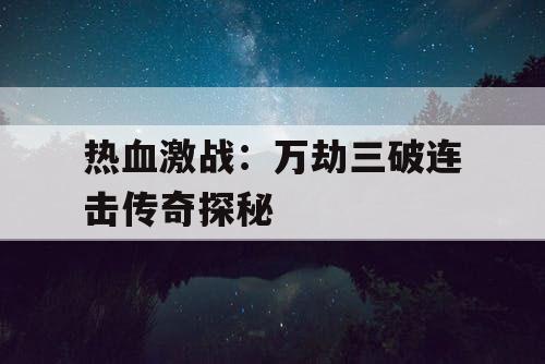摘要:,《热血激战:万劫三破连击传奇探秘》是一部充满激情与冒险的传奇故事。该故事讲述了玩家在游戏中不断挑战自我,突破重重难关,最终获得胜利的历程。故事中充满了激烈的战斗和惊险的探险,玩家需要运用智慧和勇气来应对各种挑战。通过不断的努力和探索,玩家最终能够获得强大的力量和珍贵的财富,成为传奇中的佼佼者。这部作品展现了热血激战的精神,为玩家们带来无尽的乐趣和挑战。